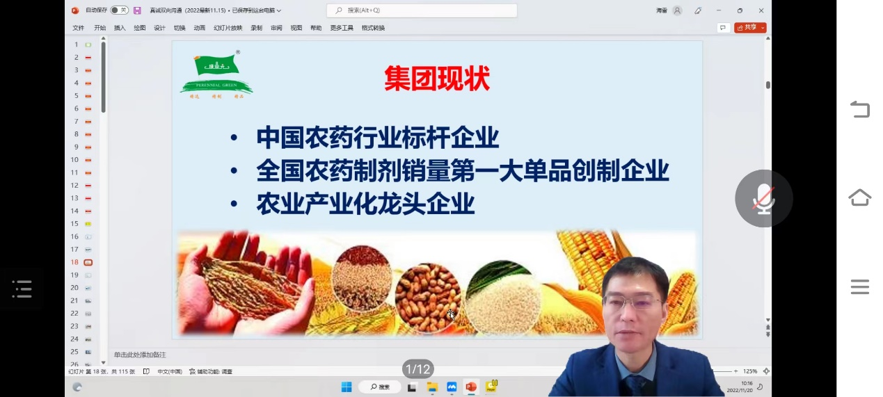 会议伊始,主讲人详细介绍了绿业元集团概况,绿业元集团具有中国农药行业标杆企业、全国农业制剂销量第一大单品创制企业和农业产品化龙头企业的美称。目前提供的岗位有市场业务员,农业技术工作人员,微信专员。