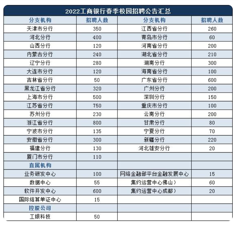 中国工商银行发布2022春季校园招聘公告,为分支机构、直属机构、控股公司公开招录8520人。其中,31家分支机构招录7605人,浙江省分行招录人数最多,为800人,其次是江苏省分行为750人、广东省分行600人,河北雄安分行招录最少为20人。
