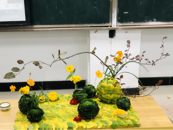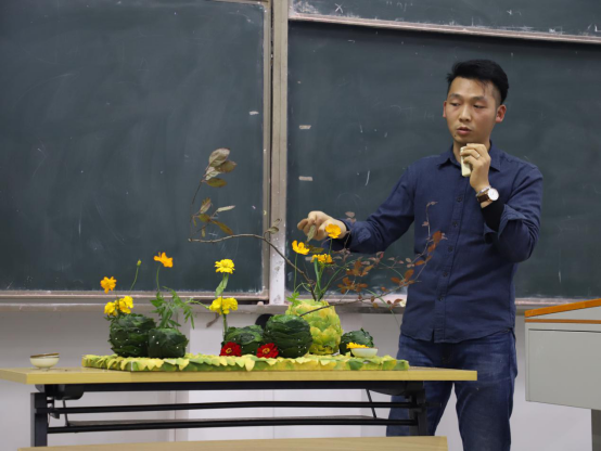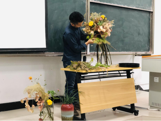 讲堂上施斌老师就地取材,利用信阳特色植物板栗的果实,校园内的栾树果,紫叶李枝条,利用秋花、秋叶、秋果制作了一件层次丰富,色彩和谐的富有地域特色的表现秋季景观的自然风花束,得到了同学们阵阵热烈掌声。施斌老师创作第二个作品主题叫层峦叠翠将传统花艺与现代花艺结合,具有信阳特色的茶叶做主花材,以银杏叶的铺陈为大地、做了一件极具信阳特色的茶席插花。老师边讲边制作边讲解,传统插花崇意尚境用三两枝线枝表现曲线空间感而让人产生联想;现代花艺则更注重色彩的表达,讲究色彩和谐施老师的两个作品完成后同学们踊跃提问,表达自己的看法和对作品的理解,现场气氛和谐热烈,看了本次表演,同学们都受益匪浅,打开了解花艺世界的大门增强了对园艺专业的认知