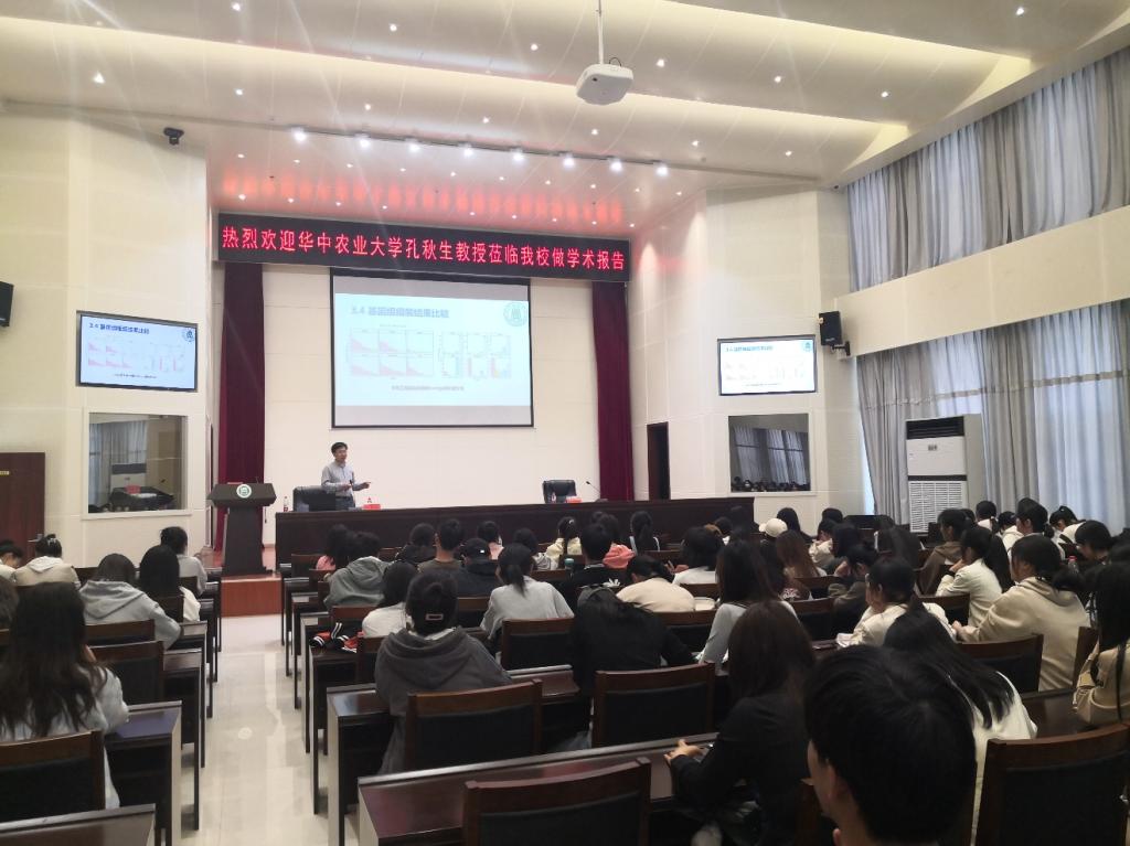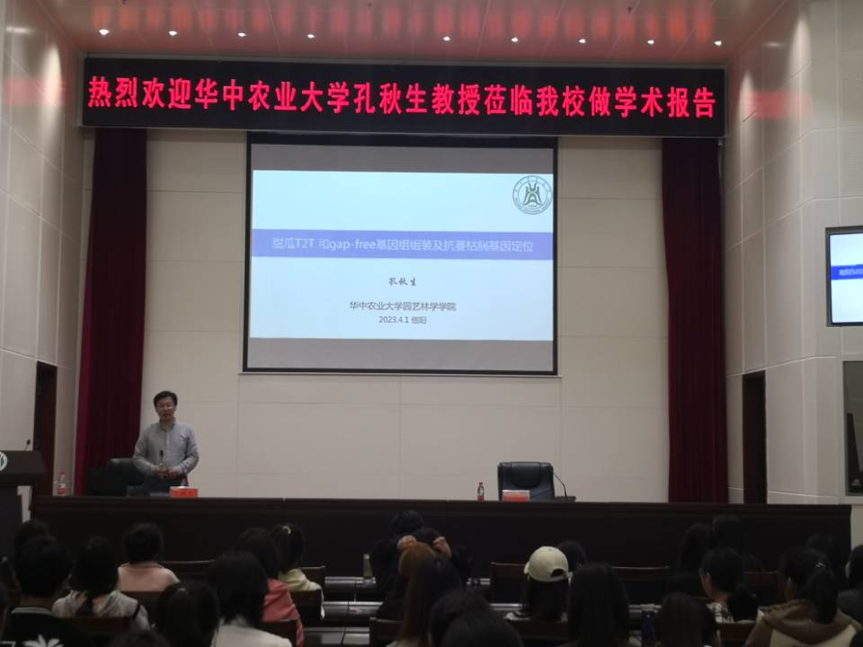 会上,孔秋生教授结合自身科研工作实践,从甜瓜蔓枯病病原菌的分离、RIL分离群体的构建、PI511890基因组从头组装注释、蔓枯病抗性基因Gsb-3的定位四个方面进行了详细的讲解,报告得到参会师生的一致好评。报告会上,孔教授还勉励参会师生要树立终身学习的理念,踔厉奋发、刻苦学习,积极投身农业实践,为国家科技进步,乡村振兴做出自己的贡献。