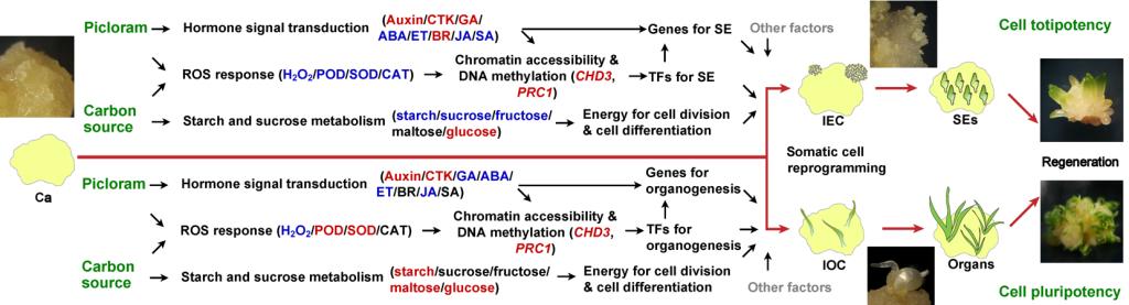 早花百子莲体细胞重编程建立SE及器官发生途径的模式图