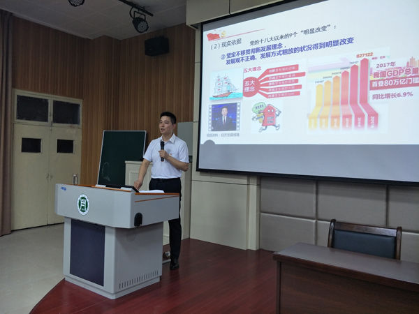 报告会上,熊元靖老师根据自己的学习和领会,从党的十九大的主题、主要成果,中国特色社会主义进入新时代,我国经济社会发展重大部署等方面对十九大报告进行了深刻的解读,重点对“中国特色社会主义进入新时代”的历史背景、现实依据、指导思想、标志和内涵以及历史使命和伟大意义进行了详细的解读。