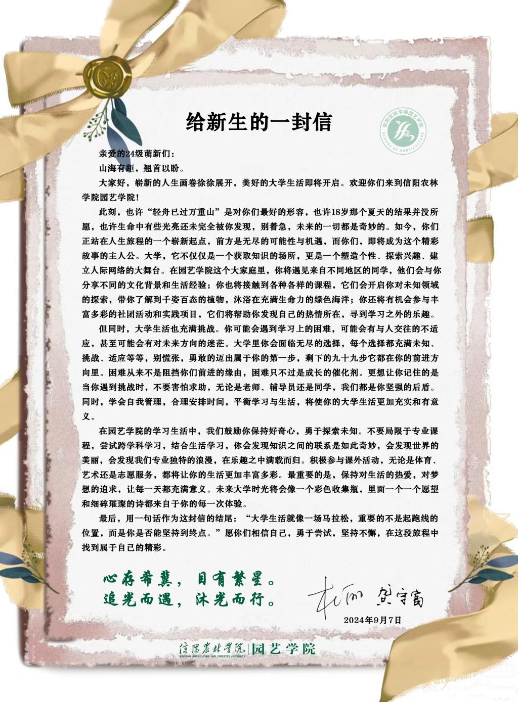 在给2024级新生的大礼包当中,还有一份特别的礼物。由园艺学院党支部书记杜丽及园艺学院院长龚守富共同撰写的“给新生的一封信”。信中他们殷切嘱托,鼓励2024级新生“保持好奇心,勇于探索未知。不要局限于专业课程,尝试跨学科学习”。希望他们相信自己,勇于尝试,坚持不懈,在大学这段旅程中找到属于自己的精彩。