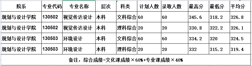 2022年学校在河南省艺术类本科计划招生160人,实际录取160人,其中视觉传达设计专业80人,环境设计专业80人。男生54人,女生106人。汉族156人,回族3蒙古族1人共青团员78人,群众82人。各专业录取分数见下表。