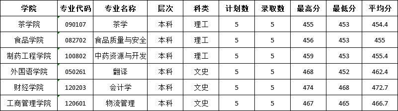 2023学校在安徽省本科计划招生30人,实际录取30人。男生11人,女生19人。汉族30人。共青团员15人,群众15人。各专业录取分数见下表。