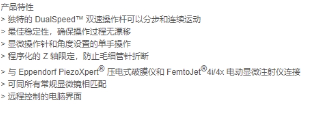 功能和适用范围:结合了人体工程学和创新设计,可以满足最严格的显微操作要求。灵活的功能,如改进过的自动归位和定位功能,甚至在zei复杂的显微操作技术中,保证了操作的简单与快速。为了方便长工作距离运动和样品快速处理定位,新 DualSpeed双速操作杆可以连续自动运动,在注射动作的所有轴向上都可以进行精确直观地运动。TransferMan 4r 对于卵细胞、早期胚胎、干细胞和微粒移取和生殖生物学中的多种显微操作应用都是非常理想的选择