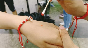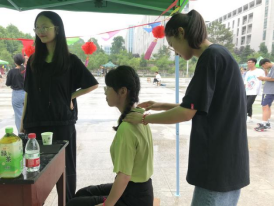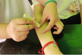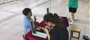 用干燥的棉签沾取一点朱砂粉,然后轻轻的点在同学们的额头或者手腕,表示端午节的美好习俗,点上朱砂痣的同学们笑容明媚,充满了少年的青春气息。