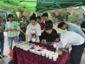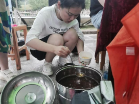 活动当天,我们把已经包好的竹筒粽子切成小块,供同学们品尝,同时也让同学们尝试讲粽子从竹筒里拿出来,活动进行的很顺利。美中不足的是,即便是做了充足的工作准备,粽子却还是供不应求,还未到工作结束70多根粽子已经被全部吃完。由此可见同学的手艺之棒与大家对粽子的喜爱。