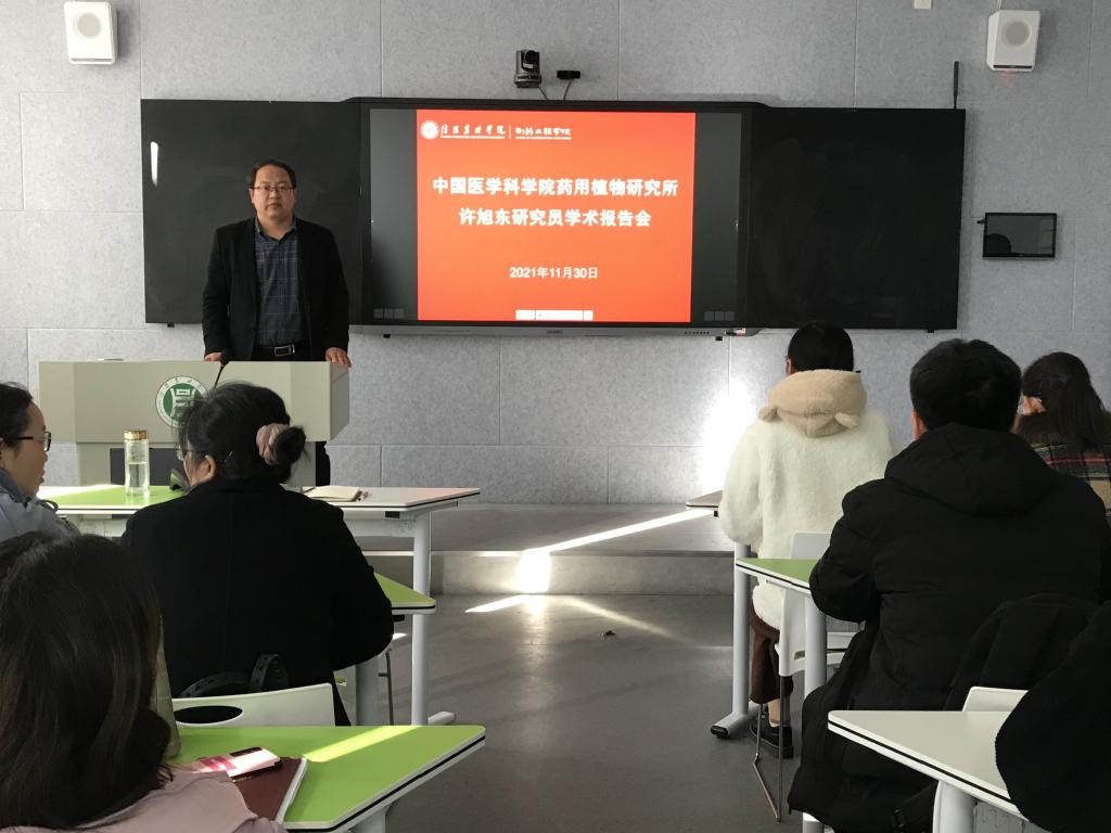 报告中,许旭东结合自身的工作经历,分别从中草药的临床创新药物、中草药的药效物质发现研究、校地合作等方面详细介绍了自己的研究成果。报告结束后,许旭东和与会师生就教学科研、研究方向选取及研究生报考、培养等相关内容进行了深入的交流。