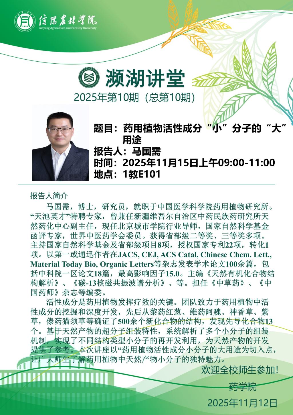 【学术报告】“濒湖讲堂”第10期:药用植物活性成分“小”分子的“大”用途