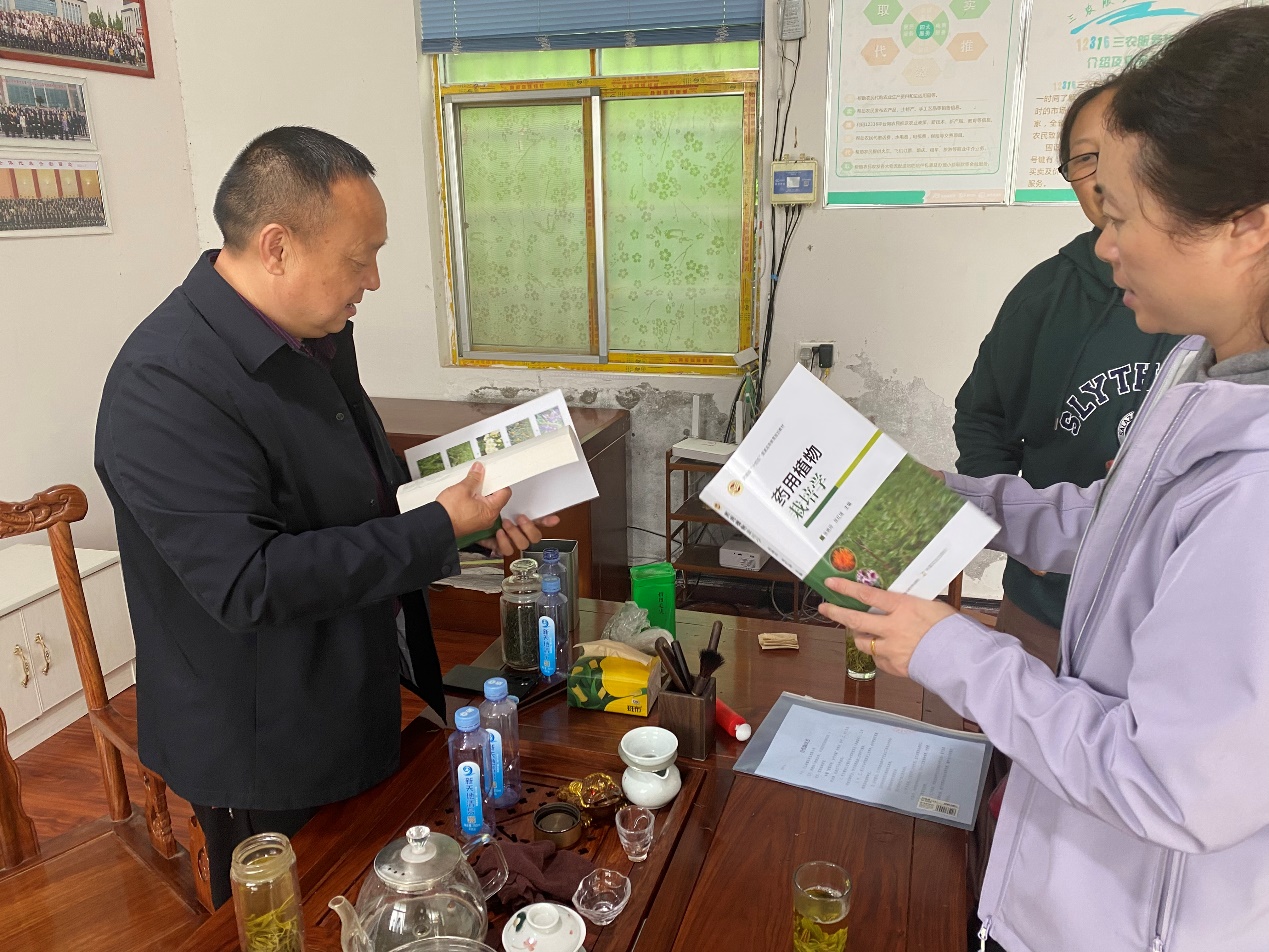在光山县鑫灿实业有限公司,服务团对公司中药材生产中的面临的问题:苍术种子质量参差不齐、不易保存、结实率低、成苗率低、生产周期长;苍术栽培过程中,易受高温强光灼伤,影响产量与挥发油的积累;苍术品种改良和选育及病虫害防控等。与企业负责人陈功斌进行了深入交流,提出了可行的解决方案,达成了共识。并围绕协助企业开展项目申报、产学研合作、技术研发等交换了意见。科技副总张艳玲向公司赠送了主编的“十四五”规划教材《药用植物栽培学》,并表示下一步认真履行岗位职责,积极完成任务,努力在产学研合作、技术研发等方面多做贡献。