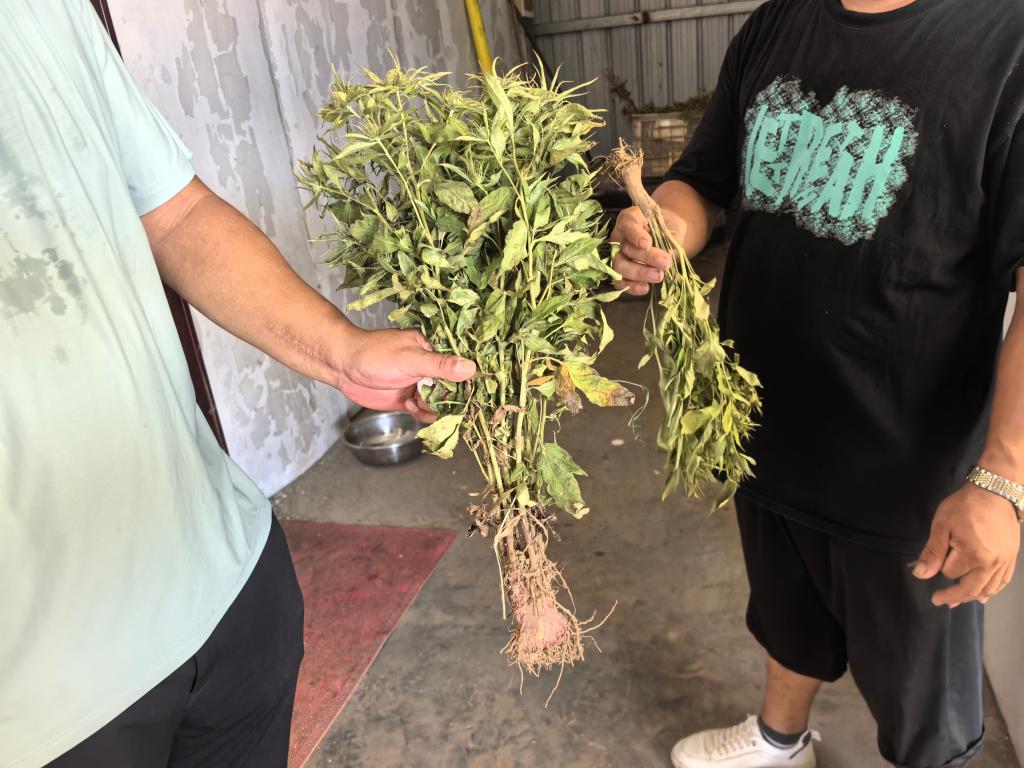 河南明勋农业开发有限公司总经理禹明勋向我们简单介绍了公司情况,该公司自2022年开始种植金丝皇菊,今年除自己种植100亩左右的金丝皇菊外,还带动村民种植金丝皇菊近万亩。企业经过3年的种植已经具备一定的种植经验,但面临极端天气,种植的金丝皇菊仍出现不同程度的灾害,目前金丝皇菊正处于分蘖旺盛期,由于持续高温干旱,金丝皇菊苗情很弱。由于基地周围没有地表水,只能用地下水灌溉,由于地下水水温偏低还不能直接浇灌,得将井水引到水池待水温达20度以上才能灌溉,给生产增加了难度和成本。专家们经过考察,建议夜晚和清早进行灌溉,或者喷施芸苔素内酯等药剂增加其抗逆性,或者采用滴灌形式减少大量冷水刺激等。