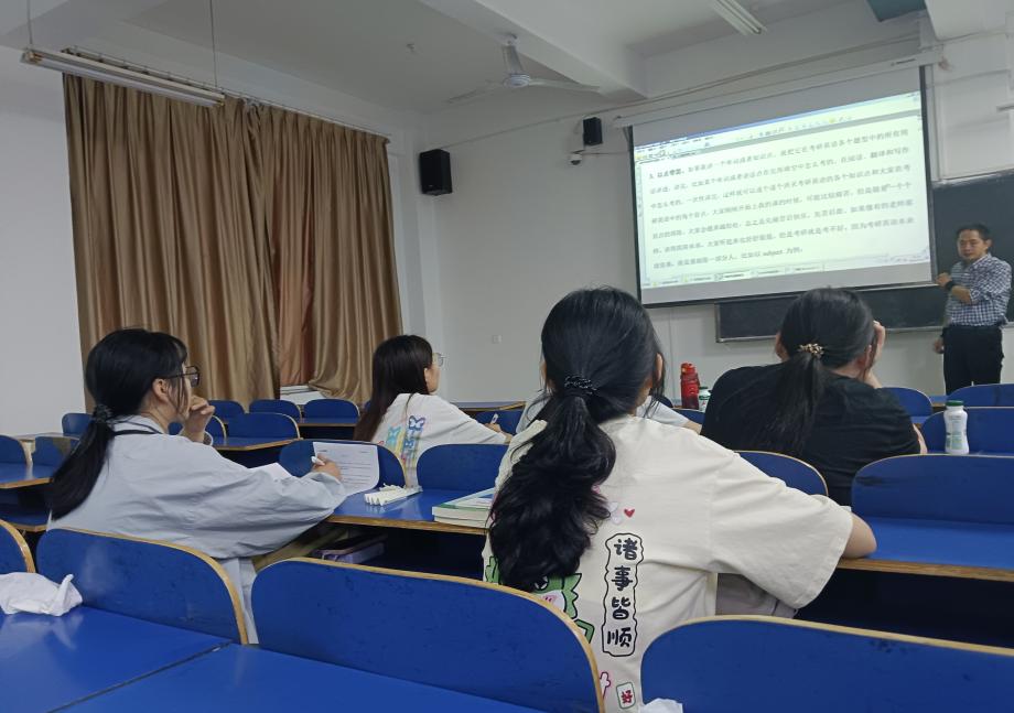 余老师从题目的深度、广度和灵活度及报名人数等角度全面地为同学们分析了近年来考研英语的总体趋势。他结合考研英语的题型和考查内容的变化,提醒同学们要打牢扎实的基础,提升阅读能力、翻译能力和写作能力。并为同学们分享了巧用词根词缀记忆单词的技巧,指导大家制定背诵计划并鼓励备考的同学:“考研的路上,每一步都充满艰辛,但每一步也都离梦想更近。坚持下去,因为这样才能收获满满的果实。”(摄影/栗晶莹 符丽萍 撰稿/符丽萍)