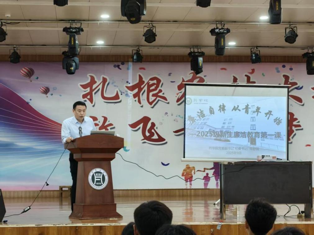 为将廉洁种子播撒进青年学子心中,9月26日药学院于大学生活动中心开展2025级新生廉洁教育活动。活动由药学院党委副书记朱舒翼主讲,药学院2025级全体学生参加。